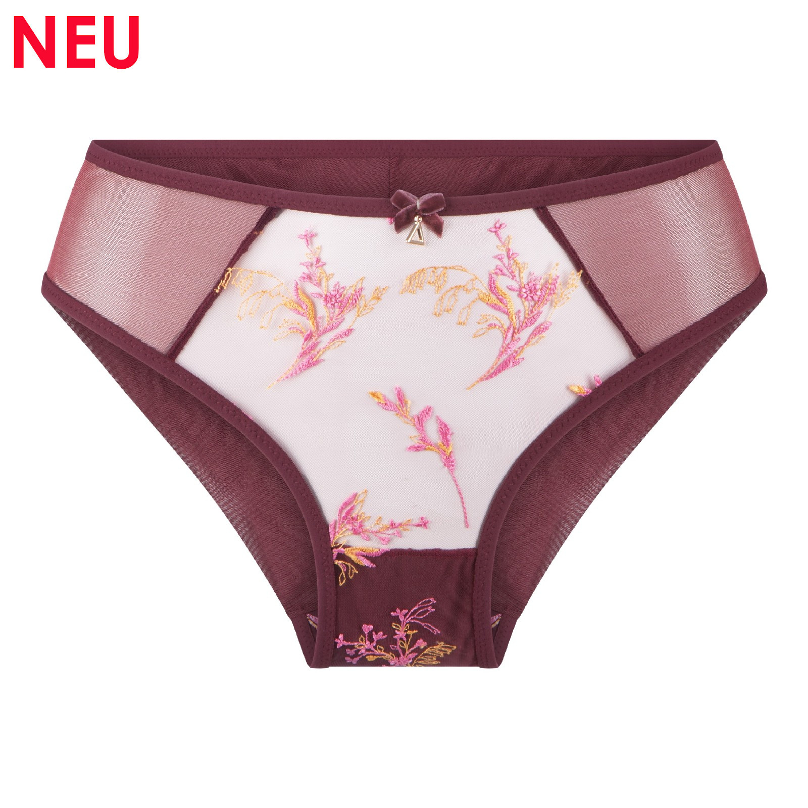 Hauchzarter weinroter Tüll mit exklusiver Blütenstickerei in Pink und Goldgelb!