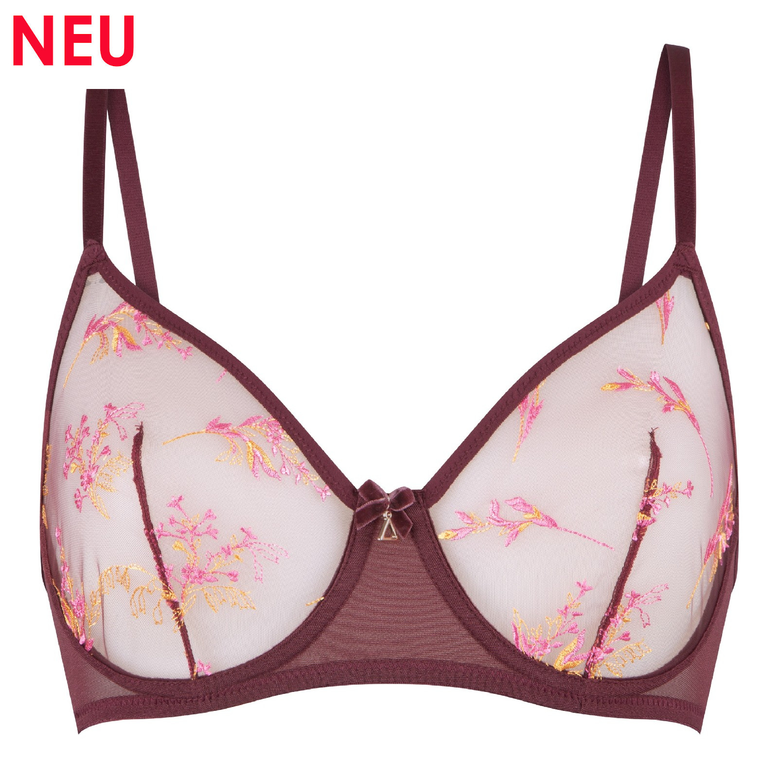Hauchzarter weinroter Tüll mit exklusiver Blütenstickerei in Pink und Goldgelb!
