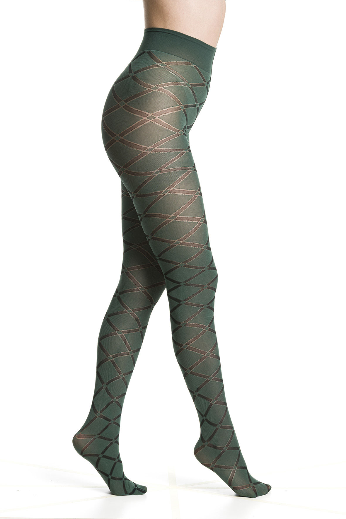 Semitransparente Feinstrumpfhose mit Karomuster in Dunkelgrün mit Schwarz.