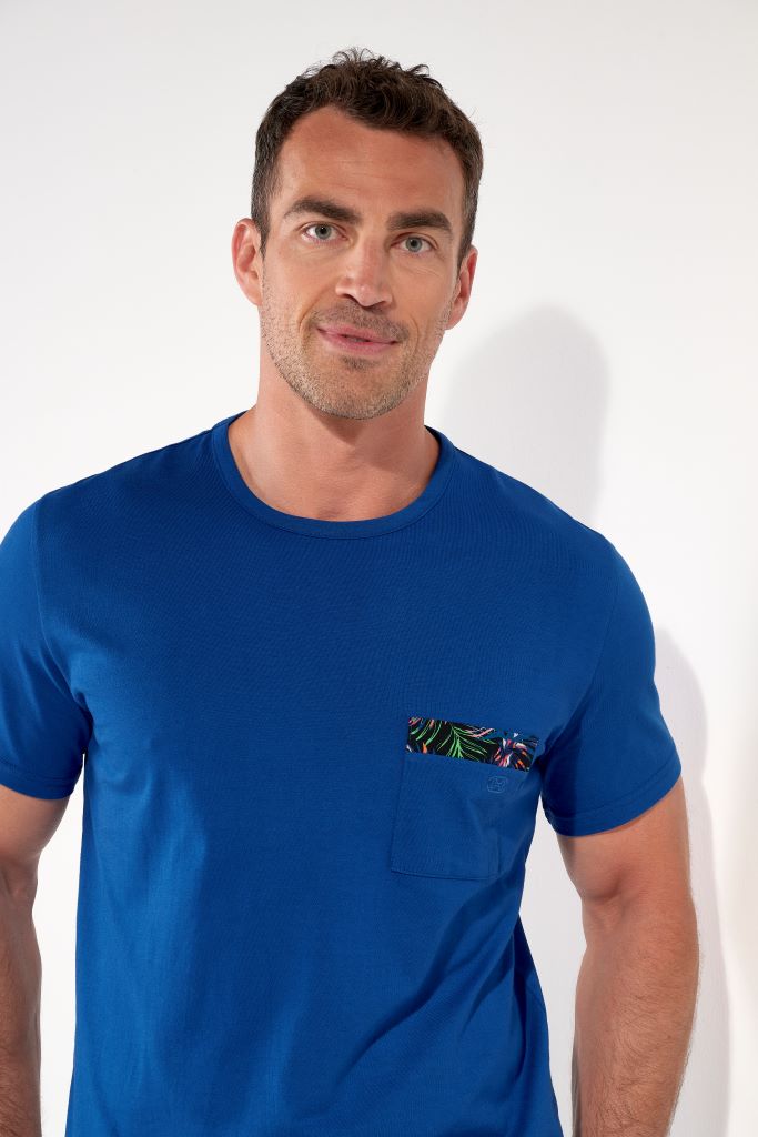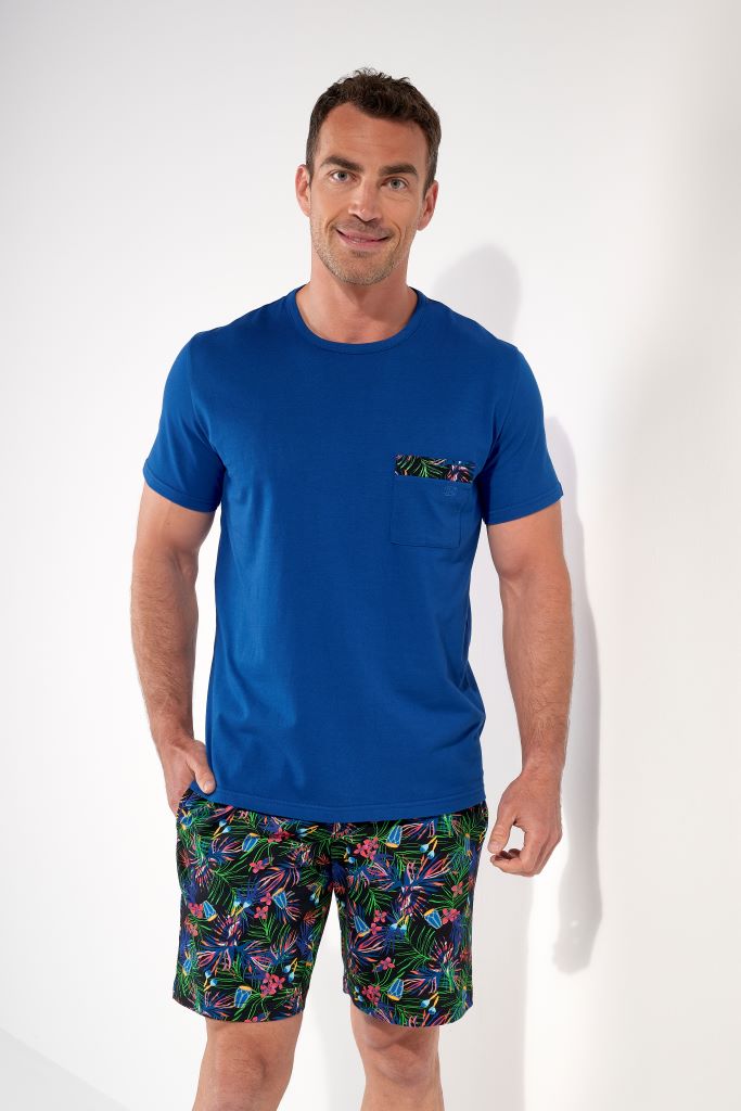 HOM Nachtwäsche mit dem gewissen "ETWAS"! Die Schnitte sind meist klassisch, das Design reicht von chic bis schrill - jedoch nie langweilig. Short Pyjama aus feinem Baumwolljersey mit leuchtend blauem Oberteil und gemusterter Hose.